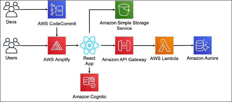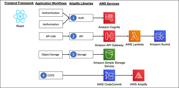 The architecture uses the Amplify console to host the application based on source code uploaded to CodeCommit. An added benefit of hosting on Amplify is that it provides CI/CD right out of the box, which means any updates made to the CodeCommit branch automatically trigger a new build. This drastically speeds up the iterative development and testing phase. The application code itself leverages the Auth, Storage, and API libraries to interface with the correlating AWS services (i.e., Amazon Cognito, Amazon API Gateway, and Amazon S3). Each of these libraries are important building blocks that can be used to build any application, but let’s breakdown each of these application components in this example
