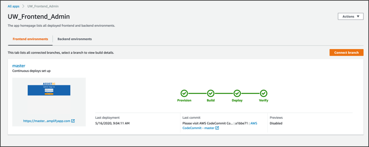 One thing that cannot be emphasized enough is the ability to quickly iterate. It can be tedious to manual build deployment pipelines and automation, but with Amplify this no longer becomes a concern. Amplify actually automates this process for you out of the box and all you have to do is point it at your code repository. Once Amplify knows where your code is, it can monitor your deployment branch for changes and whenever a change is detected a new build will be triggered. This drastically speeds up the iterative design process that developers go through when building and testing applications. The image below is an example of what you see in the console when a build is triggered. You get step by step updates about the status of your builds.