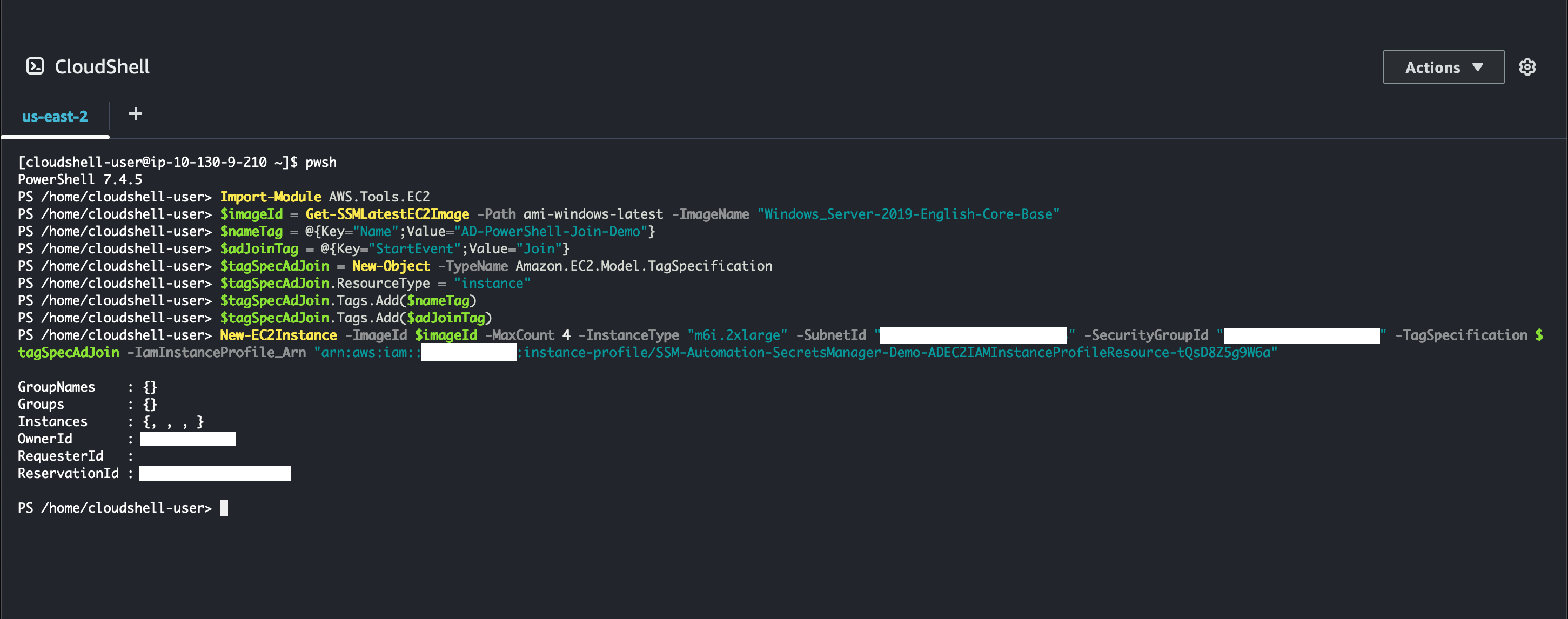 New-EC2Instance -ImageId $imageId -MaxCount 4 -InstanceType "YOURINSTANCETYPE" -SubnetId "YOURSUBNETID" -SecurityGroupId "YOURSECURITYGROUPID" -TagSpecification $tagSpecAdJoin -IamInstanceProfile_Arn "YOURINSTANCEPROFILEARN"