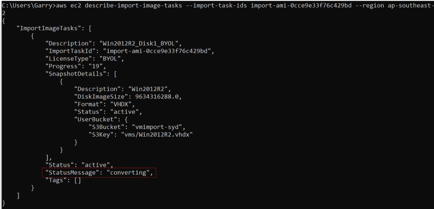 $ C:\> aws ec2 describe-import-image-tasks --import-task-ids import-ami-0cce9e33f76c429bd
