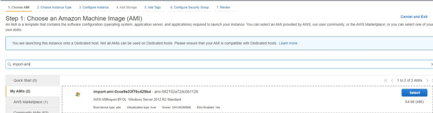 - After clicking Launch Instance under EC2, select the imported AMI under My AMI. I’ve used the AMI name ‘import-ami-0cce9e33f76c429bd’ that we captured during the import proces.