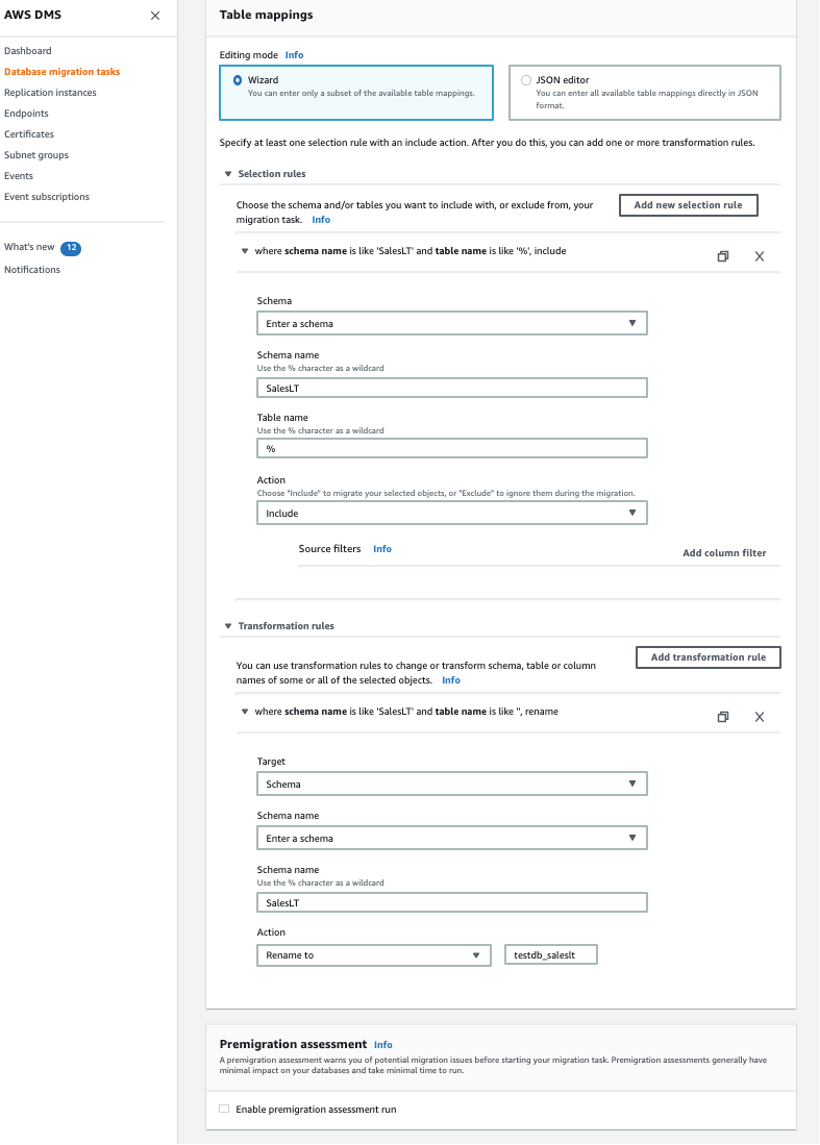 Complete the database migration service configuration by updating the ‘Table Mappings’ section, as illustrated in Figure 19.