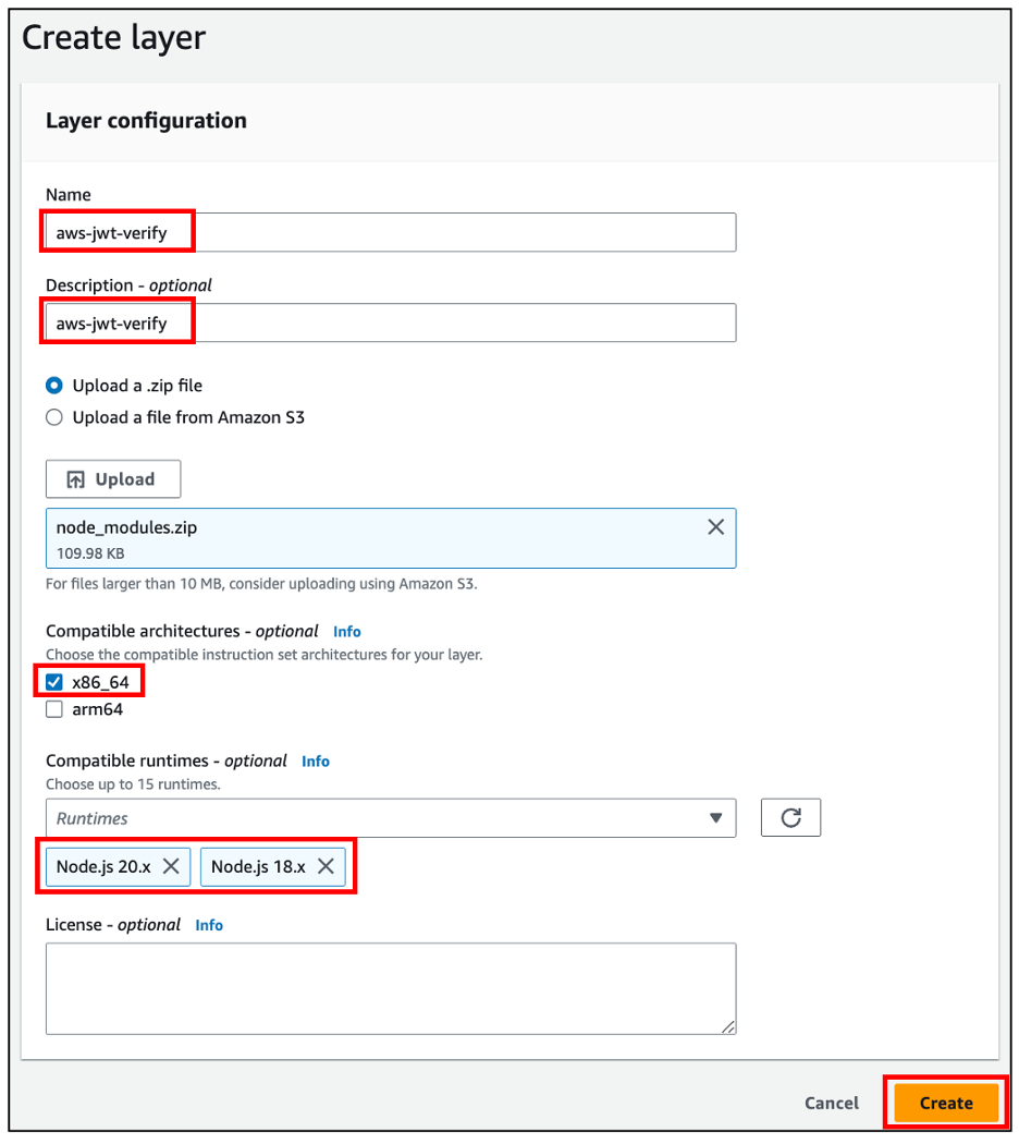 4. On the Create Layer page, as shown in Figure 8, specify Name (for example, aws-jwt-verify) and Description to your layer and Upload the .zip file you created in step 2 above. For Compatible runtimes, add Node.js runtimes 18.x and higher.