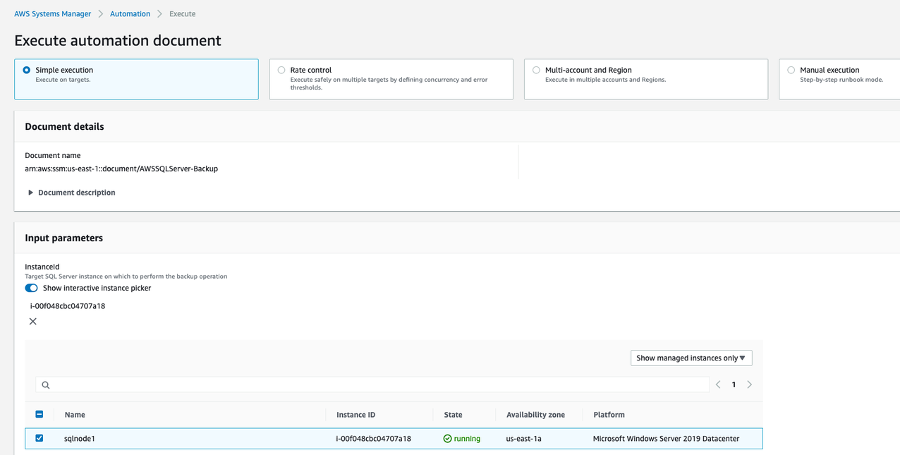 In this example, we will show how to back-up a specified database using the AWSSQLServer-Backup document.