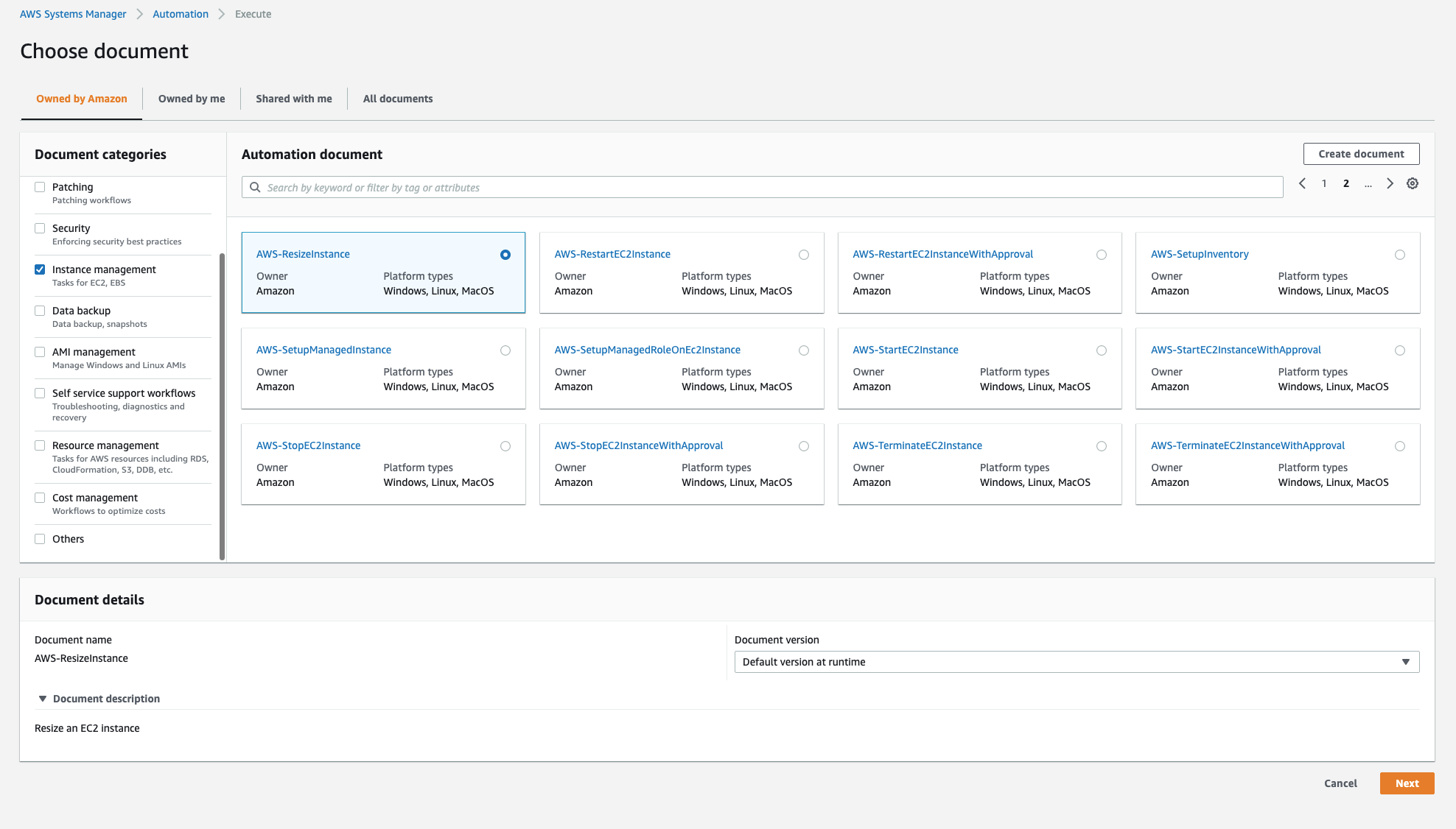 In the Automation document list, choose AWS-ResizeInstance document.