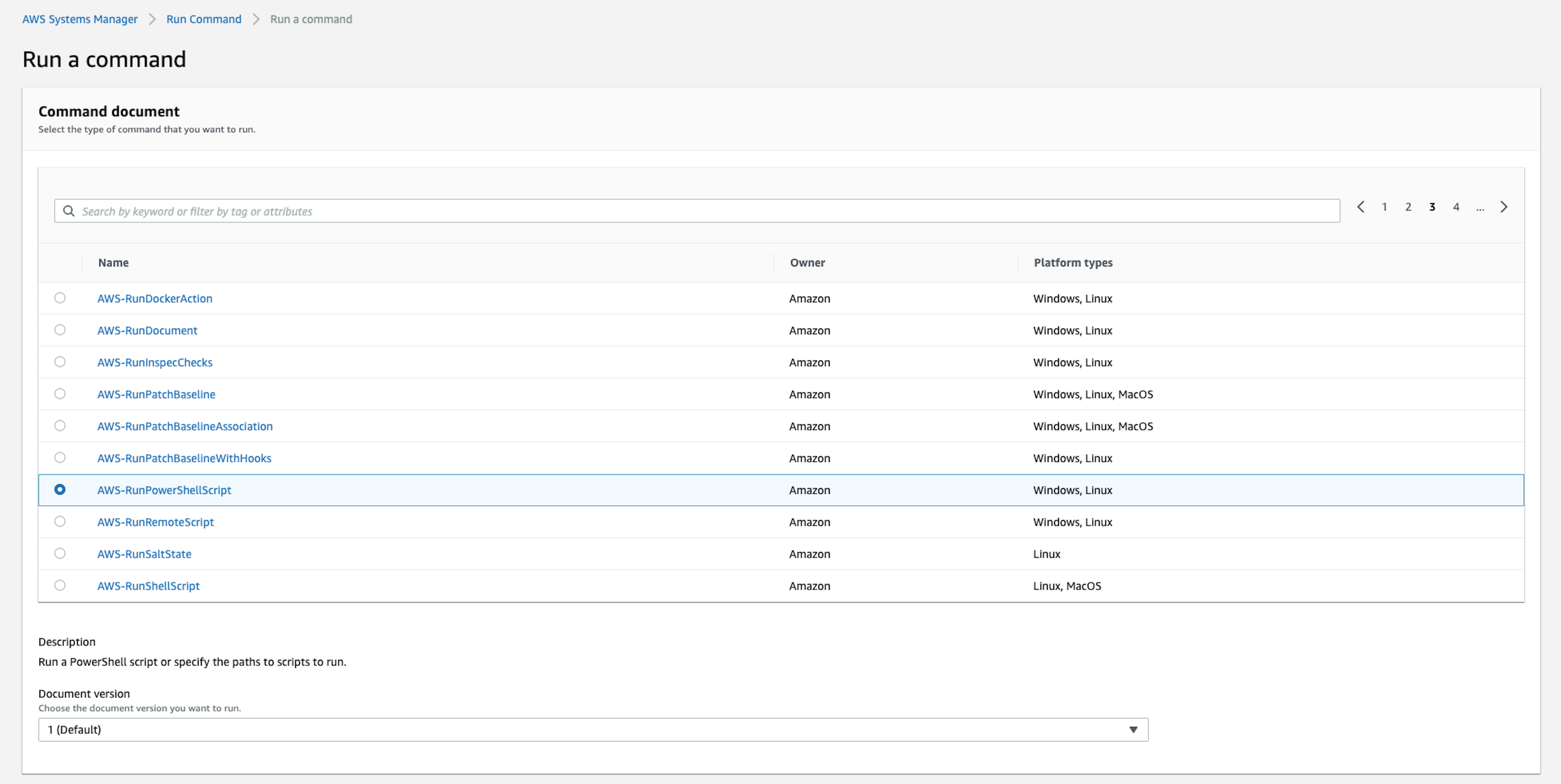From the AWS Systems Manager console, select Run Command, and select the AWS-RunpowerShellScript document.