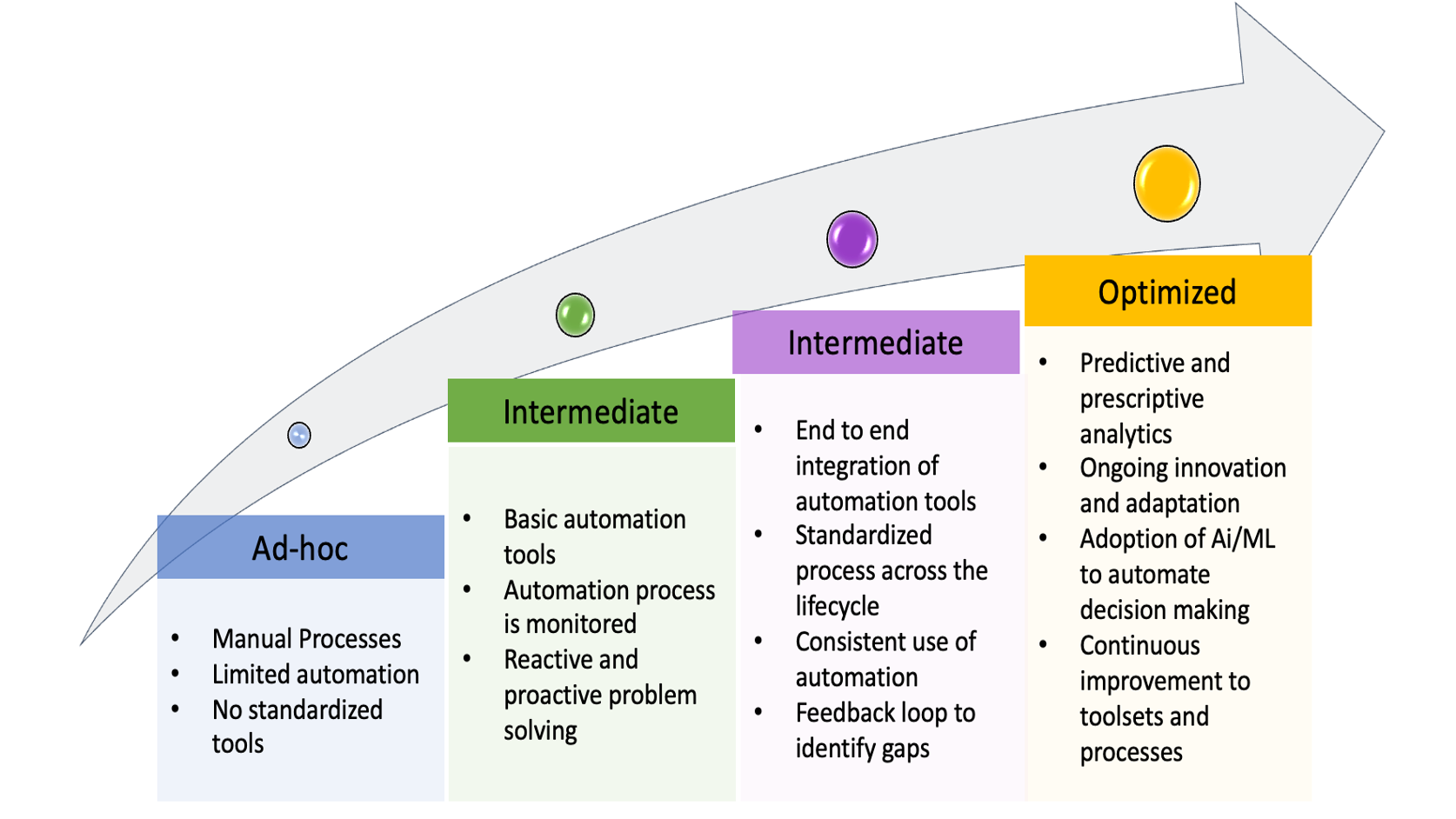 Most organizations typically assess their current state of automation using maturity models. Maturity models are good guides to setting automation goals, formulating an automation roadmap, and prioritizing automation investments. Organizations generally tailor maturity models to align with their specific needs.