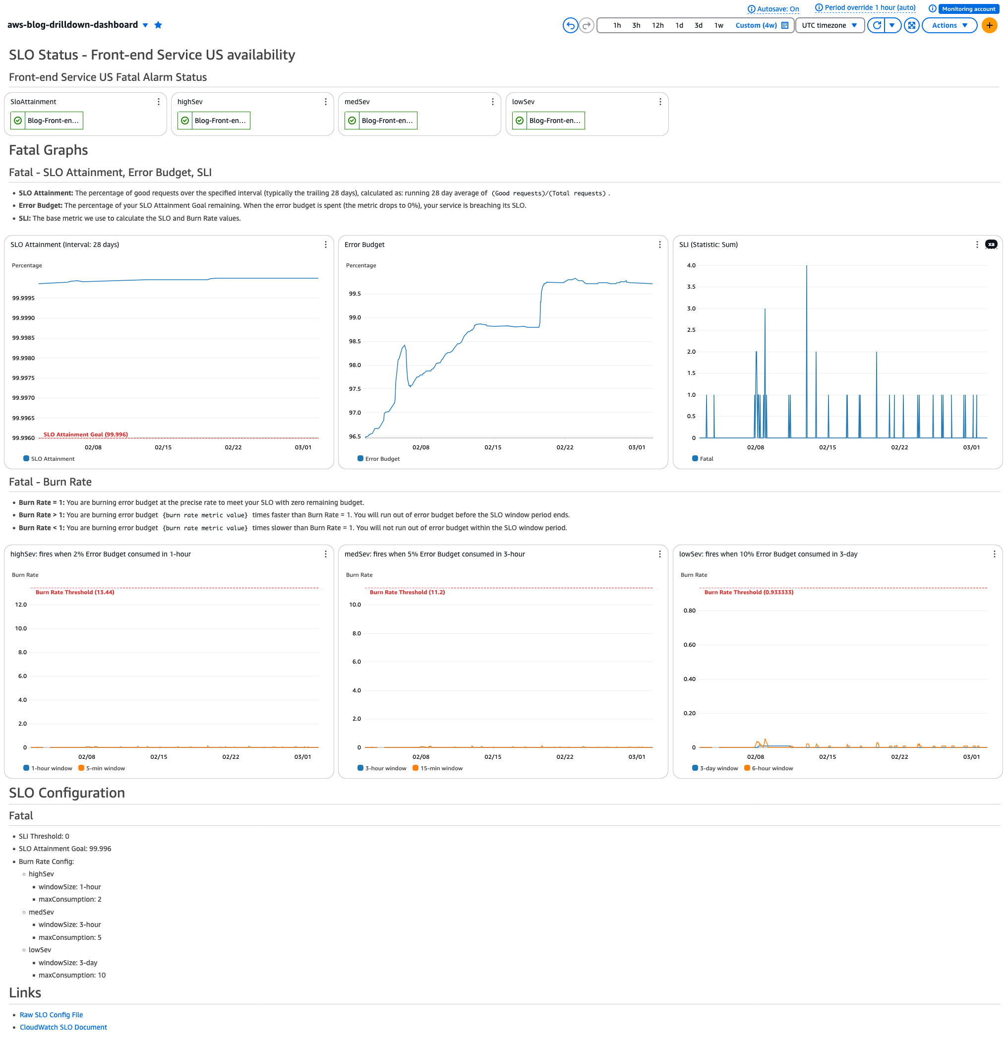 - Alarm status badges for SLO Attainment, High severity, Medium severity, Low severity burn rate alarms