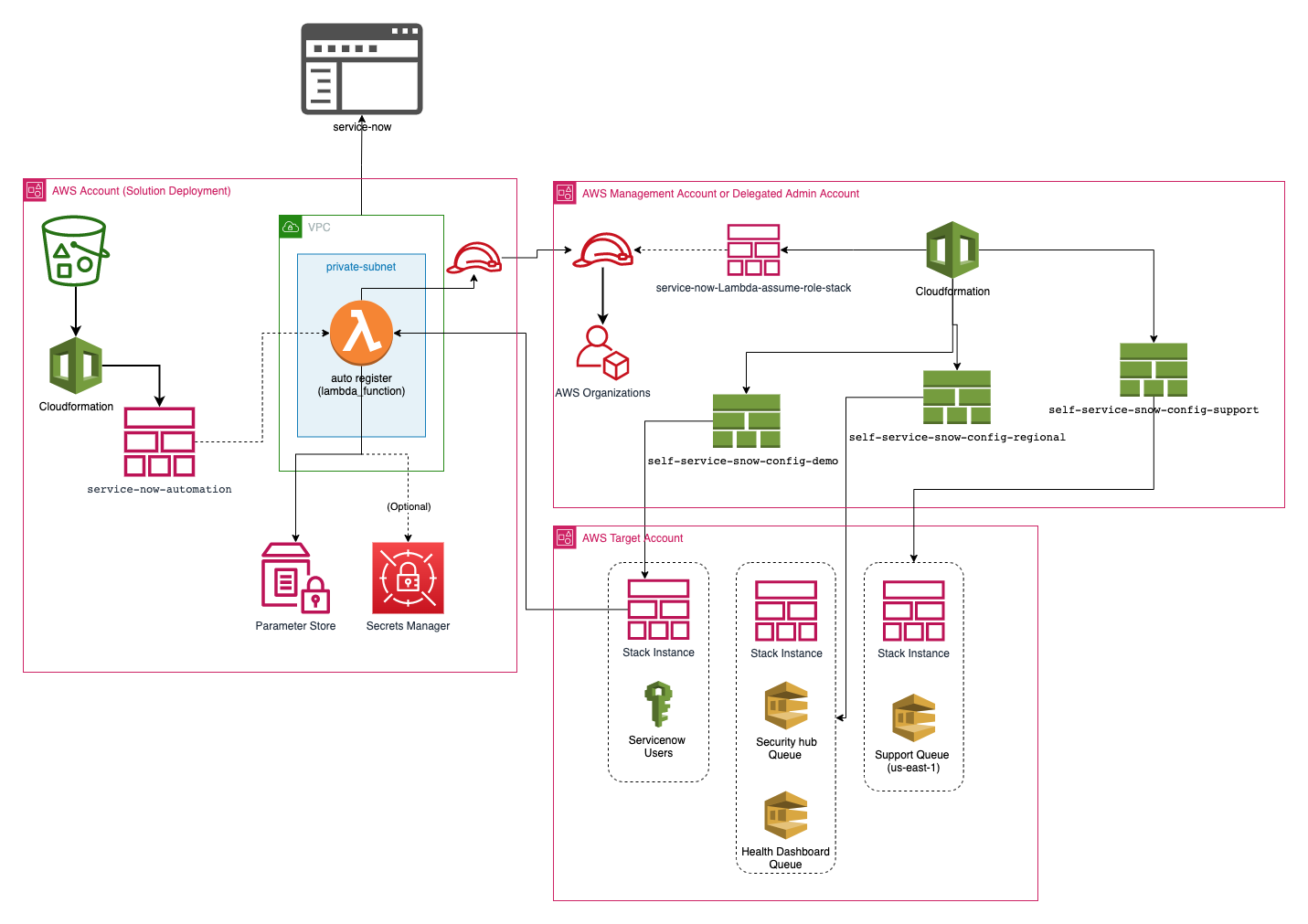 - An AWS account where the Lambda function will be deployed and where your ServiceNow account credentials will be securely stored in AWS Systems Manager Parameter Store (referred to as Solution Deployment account in this README).