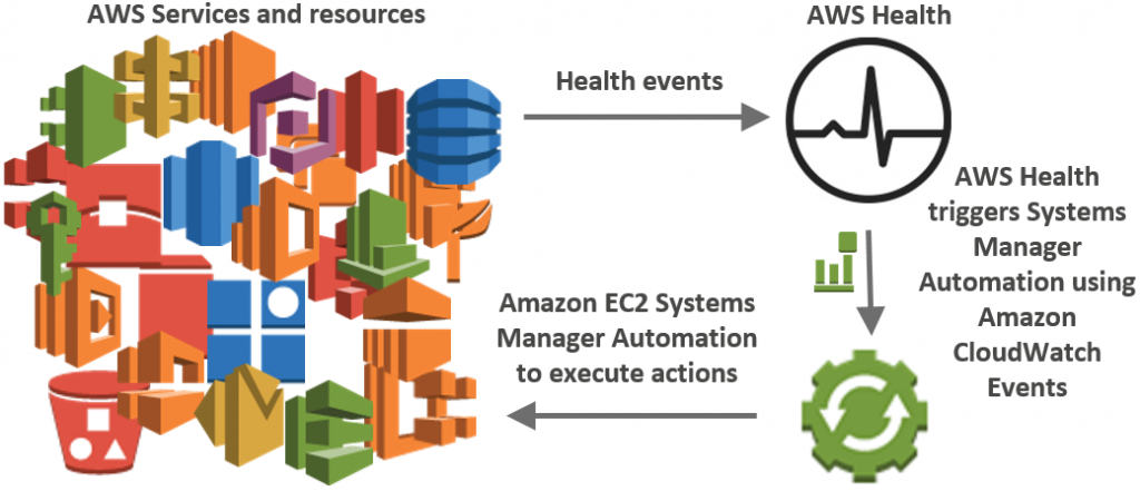 Both services are integrated with Amazon CloudWatch Events, allowing AWS Health events to trigger SSM Automation documents.