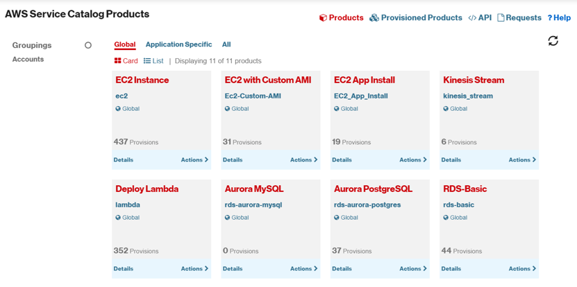 End users get a shopping cart-like experience whenever they provision resources in their account. This process helps us maintain provisioned resources consistent across all accounts and meet our compliance requirements.