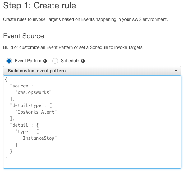 1. Save the following event pattern as a file named OpsWorksAutoHealingPattern.json.