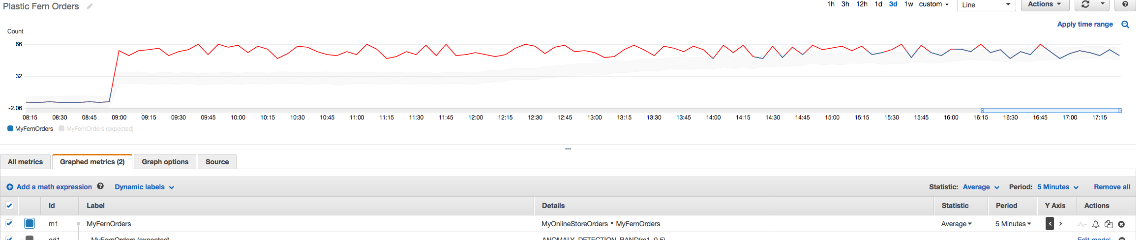 In this tutorial, we enabled Anomaly Detection for a metric on plastic fern orders from our online store. We then set an alarm that identifies orders that are below the confidence band. This is determined by the Anomaly Detection model, which has learned expected behavior from historical fern order data.