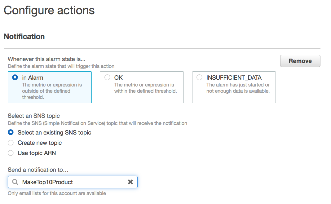 We will now configure the alarm to send a notification to a predefined SNS topic that a Lambda function is subscribed to.