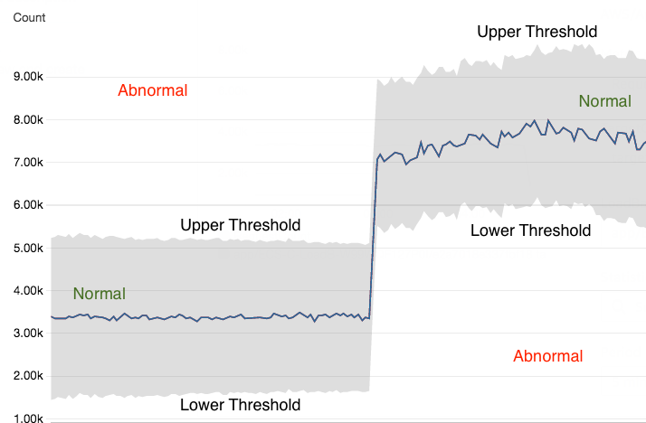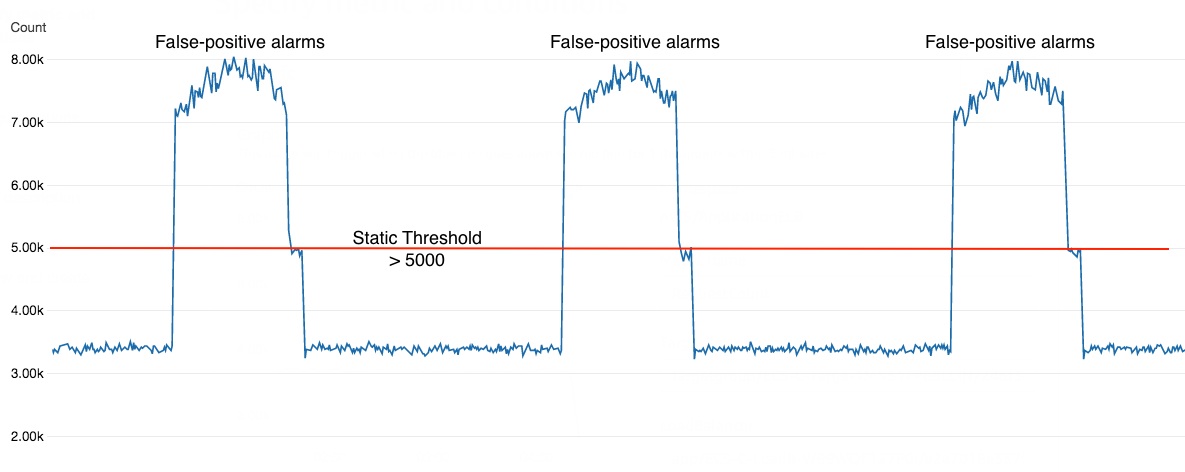 You can set up alarms for a metric by selecting a threshold value in which to invoke a set of actions. Setting a fixed threshold value is known as a static threshold, which may meet your needs. Applications that exhibit organic growth or seasonal behavior, such as peak traffic during the day that tapers off at night, are difficult to monitor using static thresholds. If the threshold is too broad, it may not detect unusual behavior. In this situation, most people resort to creating tighter and tighter thresholds, and end up with a large number of false-positive alarms over time.