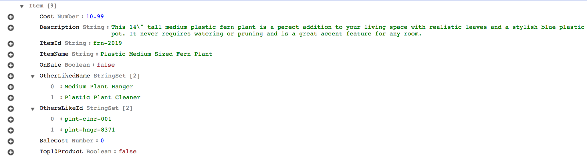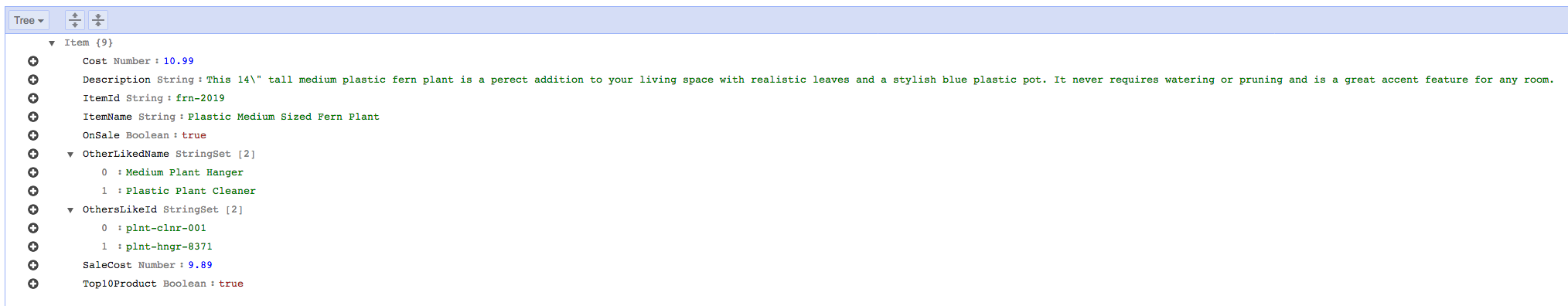 When the alarm is triggered it invokes our Lambda function. The Lambda function updates the fern item in the DynamoDB table setting the “Top10Product” flag to true; as seen in the figure below. This flag could be used to allow the item to be displayed on both the online store’s home page and side bar ads on your favorite social media sites and mobile applications. It also discounts the item price by 10% to attract more online sales. You can see the changes to the fern entry in DynamoDB here.