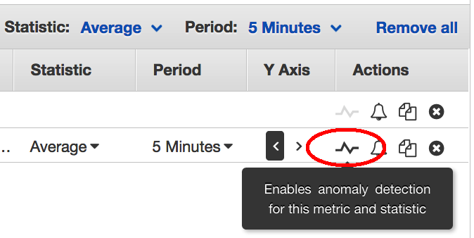 To enable Anomaly Detection on the metric you select the “anomaly detection” icon of your graphed metric as seen below.