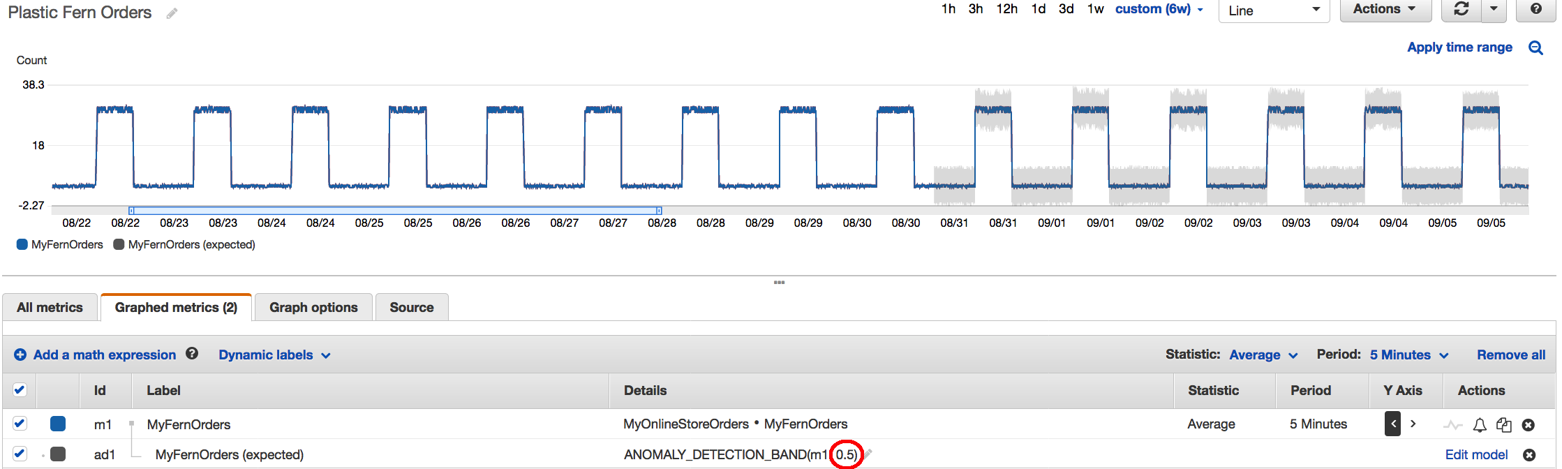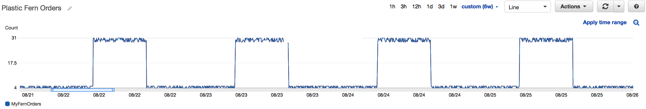 In the Amazon CloudWatch console, select Metrics, choose your metric, and select the “Graphed metrics” tab. In this example, we are looking at the the total number of “Plastic Fern Orders” that happen in a 5 minute period. These lovely plastic green ferns are selling like hot cakes at an average count of ~29 units every 5 minutes between 9AM and 5PM daily.