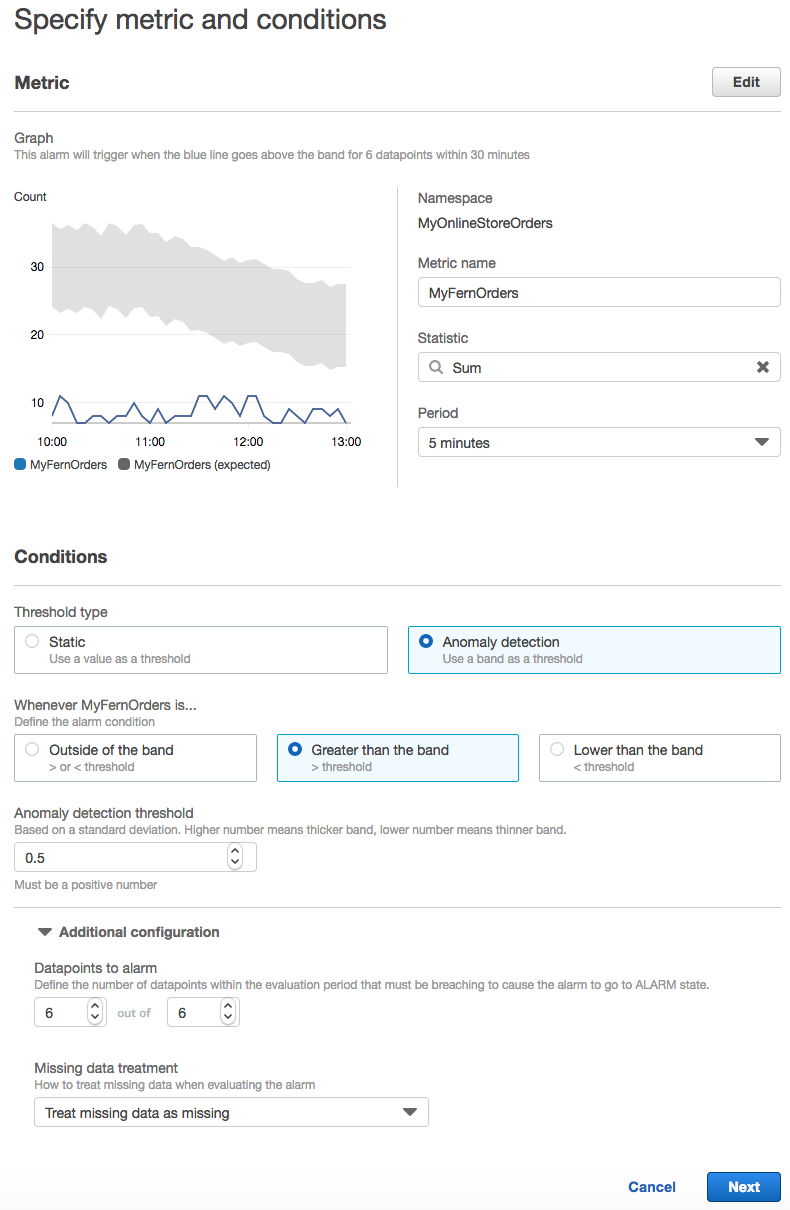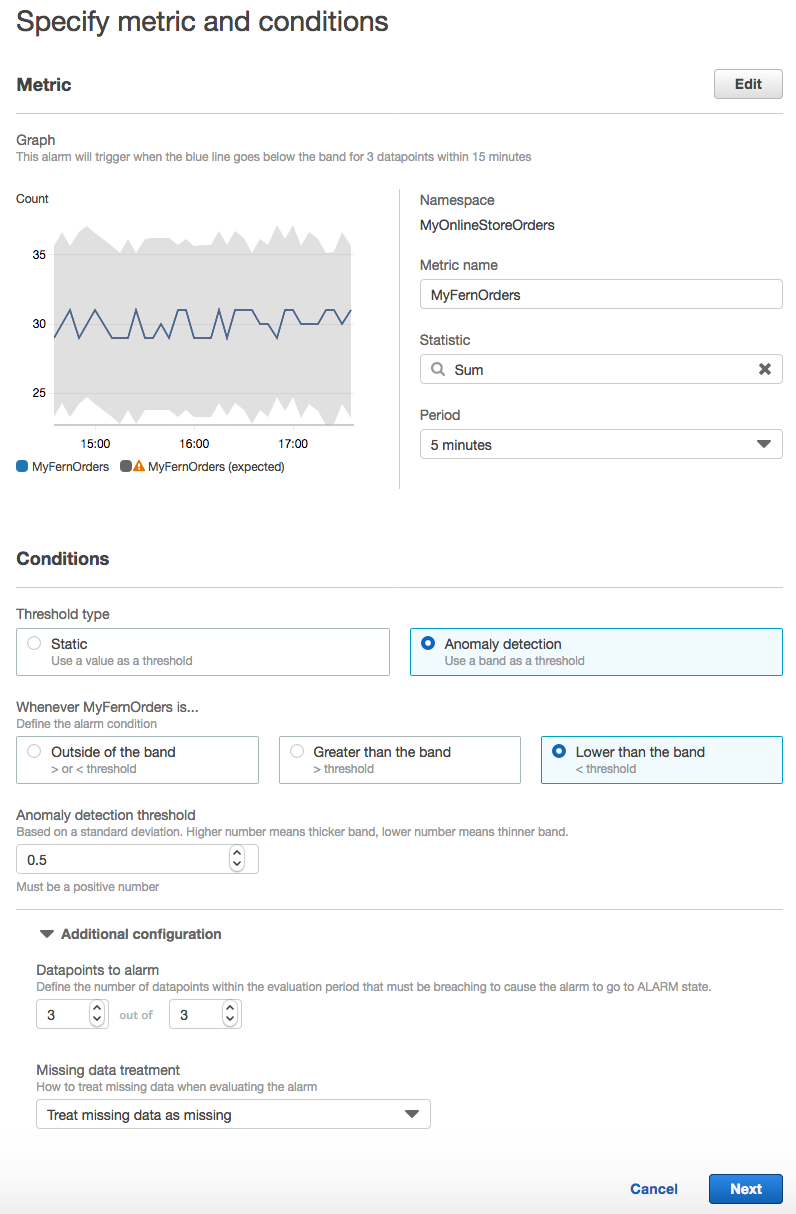 Here I have chosen the MyFernOrders metric and have chosen “Anomaly Detection” and “Lower than the band” with a period of 5 minutes, and set the “Datapoints to alarm” to a value of 3 out of 3.