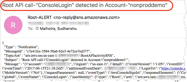 - The Lambda function then processes the root API event. It also publishes a message to an Amazon SNS topic, where the subject contains the AWS account ID or AWS account alias where the root API call was detected and the type of API activity.