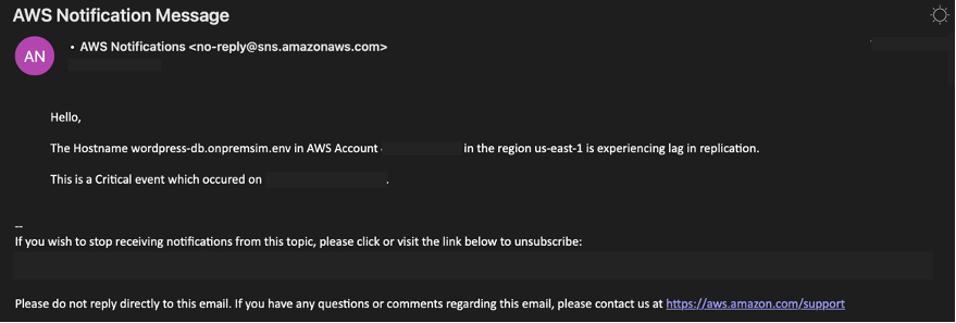 - SNSSubscriptionEmail: The email to send MGN data stall, lag, elapsed data replication, and source server disconnect alerts to.
