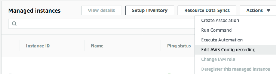 On the AWS Systems Manager console, choose Managed Instances, and then choose Edit AWS Config recording for the EC2 instance, as the following shows: