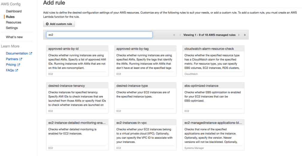 - ec2-managedinstance-applications-required – Checks whether all of the specified applications are installed on the instance. Optionally, specify the minimum acceptable version. Optionally, specify the platform to apply the rule only to instances running that platform.