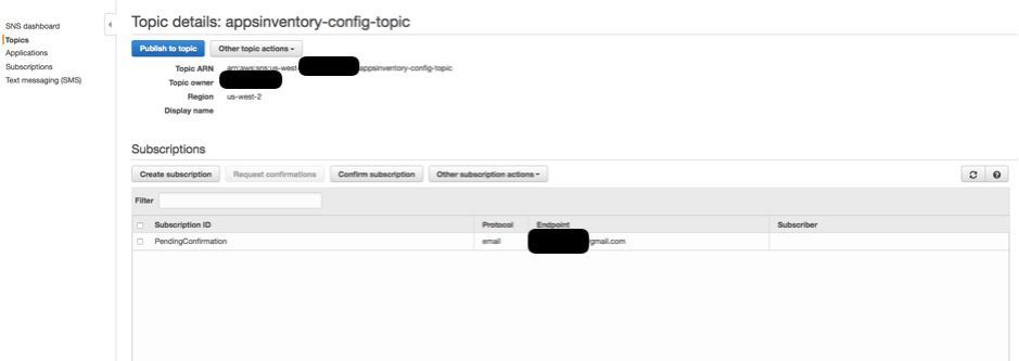 Go to the dashboard in the SNS console and create an subscription to this topic to either send an email, send a SMS, call a Lambda function, or use other delivery options. We will just choose Create subscription to send an email.