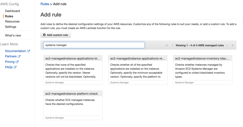 - ec2-managedinstance-applications-blacklisted – Checks that none of the specified applications are installed on the instance. Optionally, specify the version. Newer versions will not be blacklisted. Optionally, specify the platform to apply the rule only to instances running that platform.