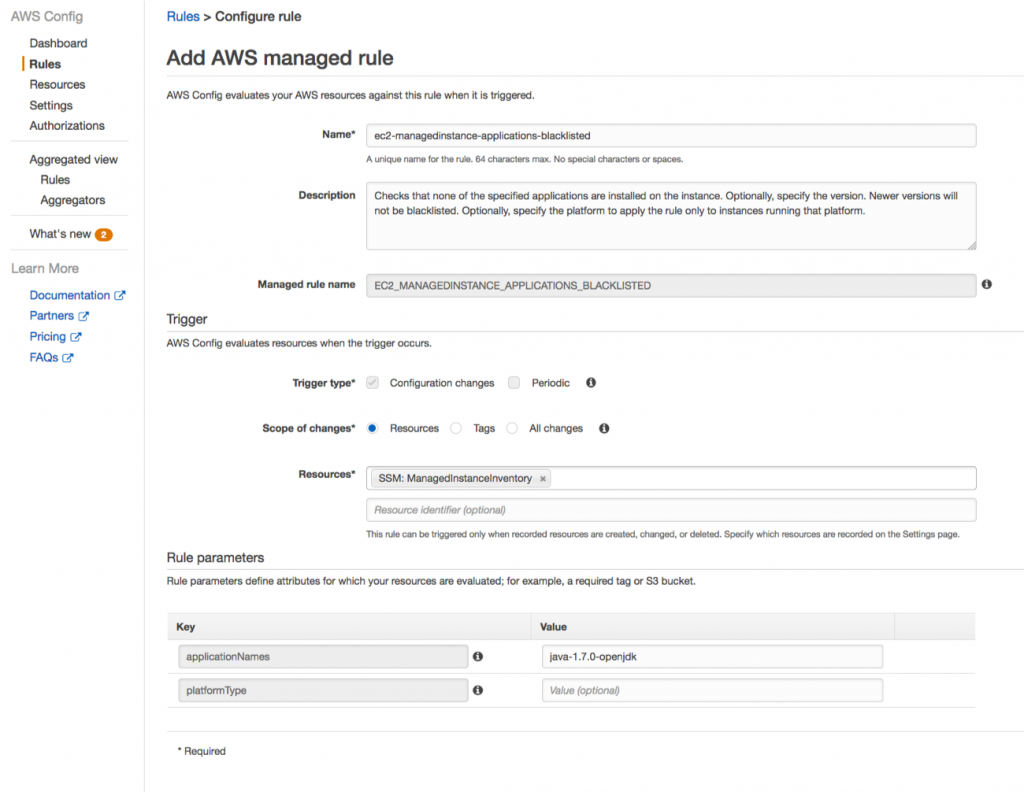 For the purpose of this blog, let’s select a built-in AWS Config rule for EC2 – ec2-managedinstance-applications-blacklisted. Using this rule, we will specify an application that we want to prohibit / blacklist in my organization and set a remediation action so that I get email notifications any time the application is installed on one or more managed instances in my fleet. In this example, we will evaluate if an old JDK like java-1.7.0-openjdk is installed on the managed EC2 instance.