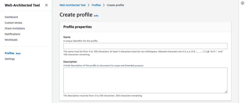 To use this feature, you will create a profile in the AWS WA Tool, where you define contextual information around your business, by answering a short questionnaire such as: