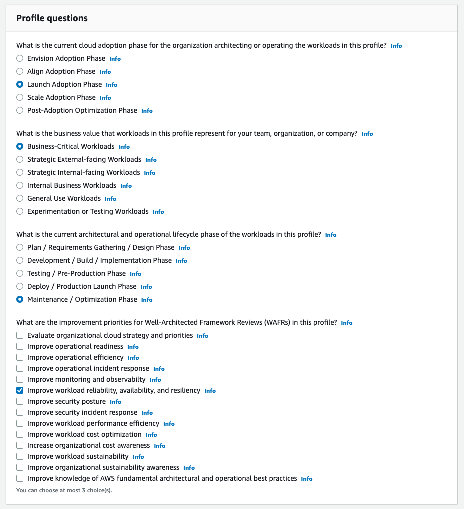 In the example below, this profile will prioritize Well-Architected questions that focus on best practices to improve the reliability, availability and resiliency, after the initial production launch of your business-critical workload. Taking into account that your organization is in the Launch Adoption phase as described in Cloud Adoption Framework here.