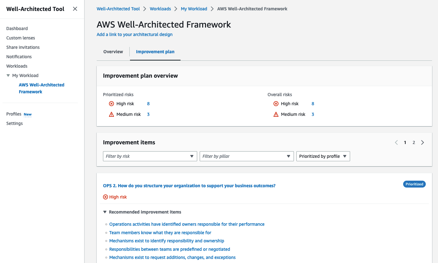The new Profiles feature in the AWS Well-Architected Tool enables you to align your WAFR to your organization’s specific priorities. You can create a profile by answering a set of pre-defined questions related to your current business goals and desired workload outcomes. You can then apply the profile to existing or new workloads to generate a set of prioritized Well-Architected questions that are aligned to your goals at that point in time. This gives you an opportunity to focus on business-critical questions first, and then return to the WA Tool to answer the remaining questions later – enabling a continuous improvement process within your organization. With the ability to share profiles, you can scale this business context to other teams, helping to ensure alignment across your organization.