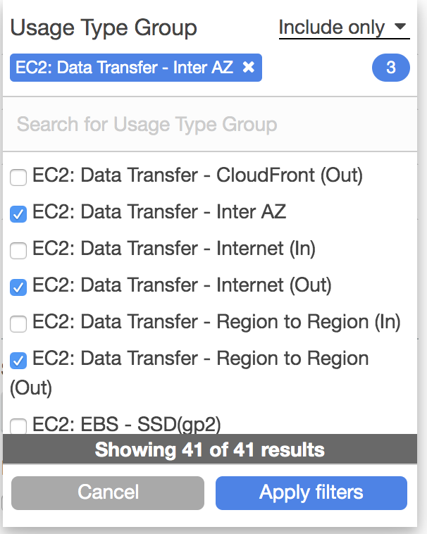 Choose Filters, Usage Type Group, EC2: Data Transfer – inter-Availability Zone, Internet (Out), and Region to Region (Out), then choose Apply filters.