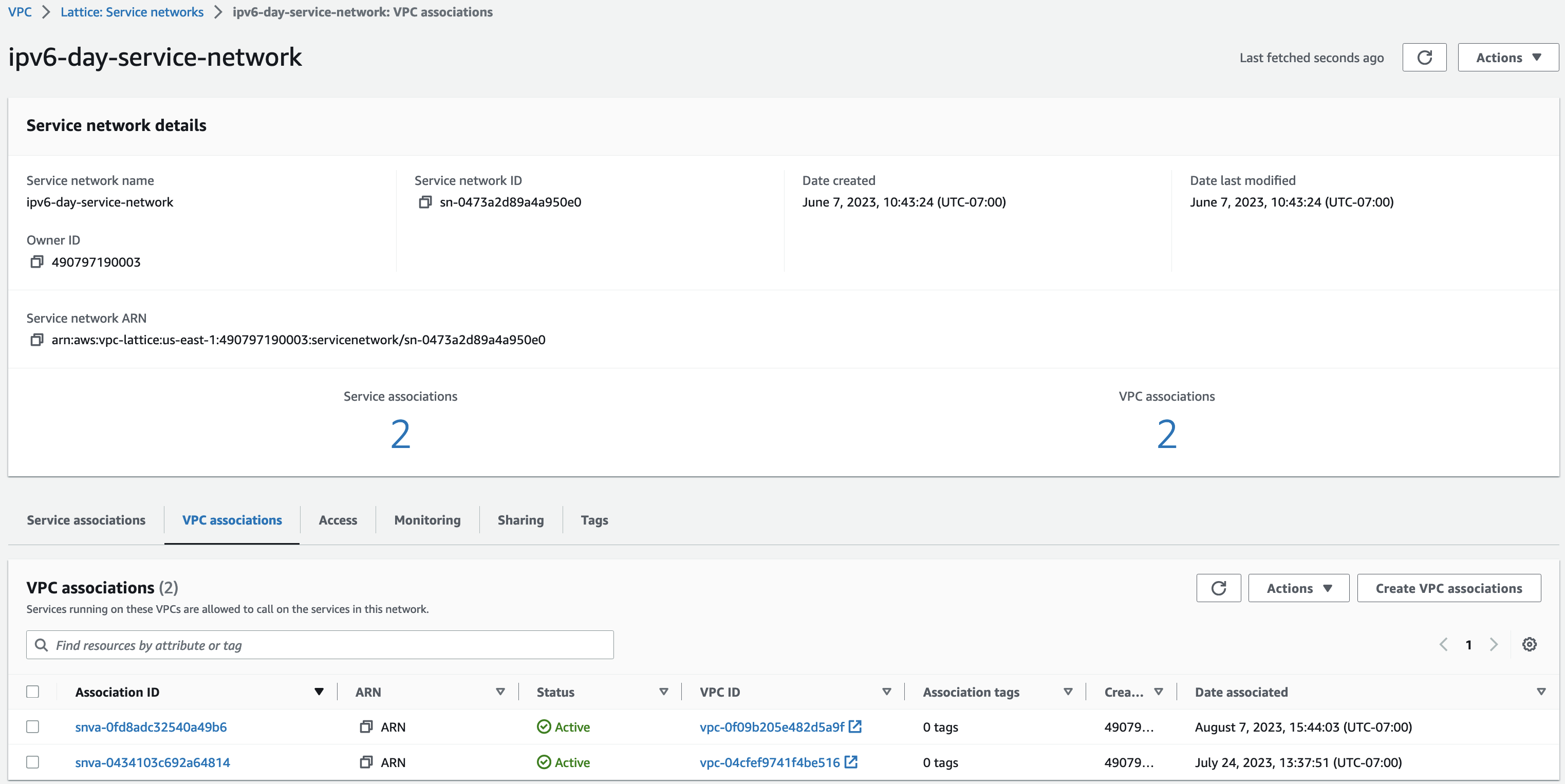 Figure 2: Amazon VPC Lattice service network ipv6-day-service-network details