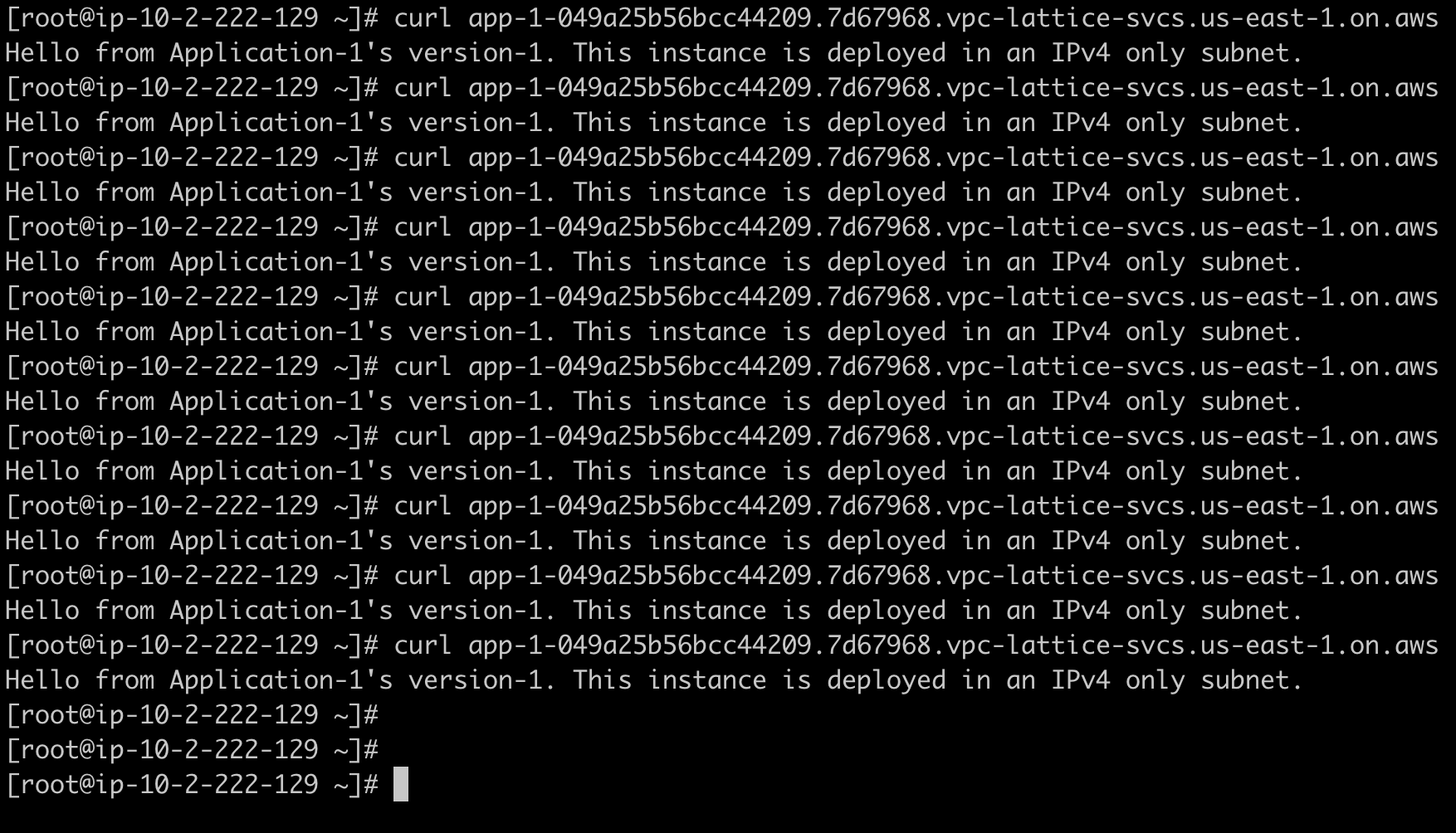 Let’s verify initial connectivity. The following terminal screenshot (Figure 6) shows a snippet from an IPv4-only instance part of App-2 IPv4 deployment, as it accesses the App-1 VPC Lattice Fully Qualified Domain Name (FQDN):