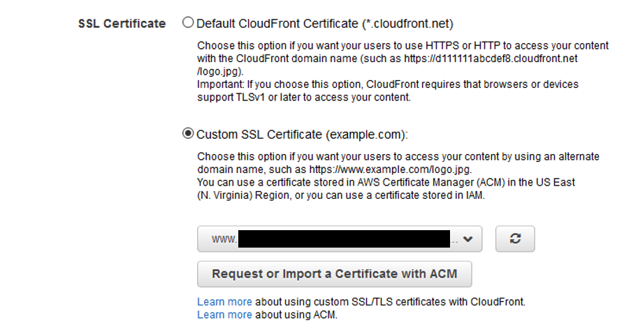 SSL Certificate – CloudFront offers two options for hosting TLS/SSL certificates. The default option is to serve only clients that support Server Name Indication (SNI). With this default option CloudFront associates your certificate with an IP address that is not dedicated to your distribution. SNI is an extension to the TLS protocol, supported by most modern browsers, that includes the domain name in the request header. This allows CloudFront to determine which certificate to use when negotiating an encrypted channel. If a client browser does not support SNI the connection can’t be secured and will be dropped.