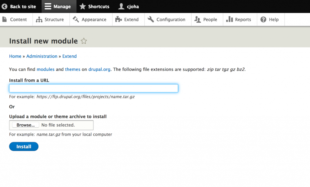 There is one module, not included in the Core Package that I would consider. This is the CDN Module, produced by Wim Leers. It has been actively developed since its initial release in 2008 and has been re-written for Drupal 8. This module changes file URLs so that CSS, JavaScript, images, audio, and videos can be cached within CloudFront more easily. It also changes the URL when a file is changed by a user in Drupal. This allows the content to be cached early, without having to think about expiring content from the cache. To enable the module, go your Drupal Administration site, and click the Extend Tab. From there, click the blue button for “+ install new module.” I looked up the latest version supporting Drupal 8, and provided the URL to the .tar.gz file. In my case, this was https://ftp.drupal.org/files/projects/cdn-8.x-3.2.tar.gz.