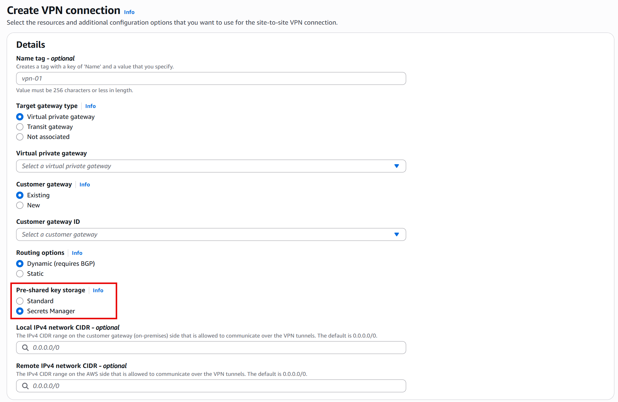 As shown in Figure 1, you can choose either Standard storage (the default option) or Secrets Manager storage. When you choose Secrets Manager storage, AWS automatically creates a secret and stores your PSK values securely.