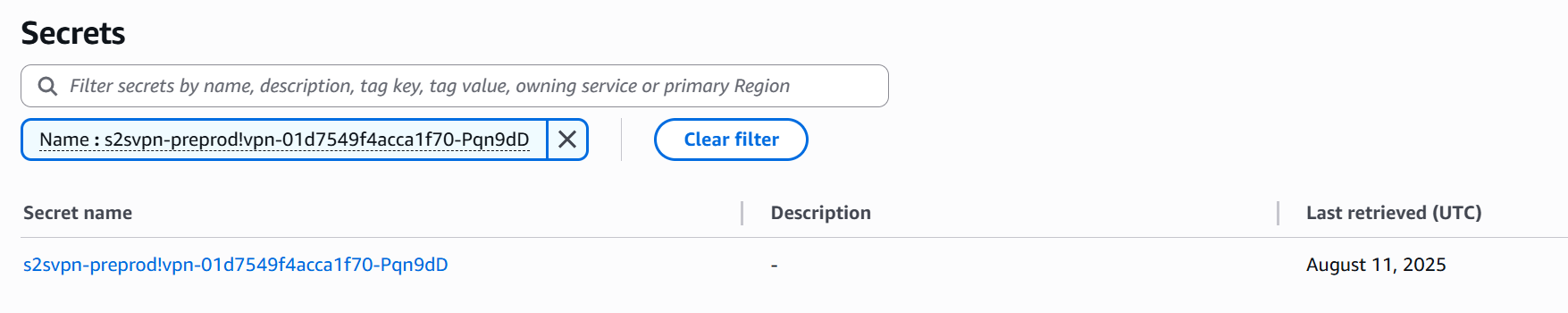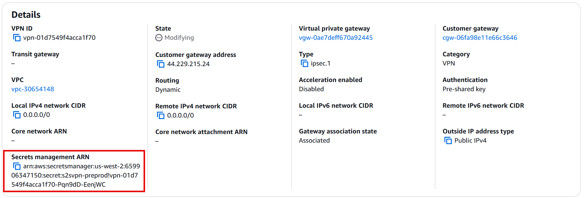 "PreSharedKeyArn": "arn:aws:secretsmanager:us-west-2:123456789012:secret:s2svpn-preprod!vpn-0074cc1c3ce9a041e-1Skga6-pevysO",