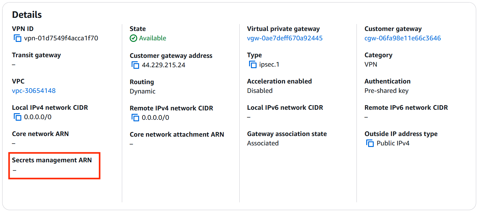 Figure 2: Secret Management ARN in VPN Connection details page