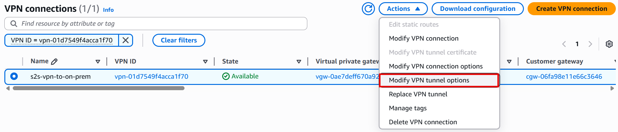 Figure 6. Modify VPN tunnel option under action menu for the selected VPN connection
