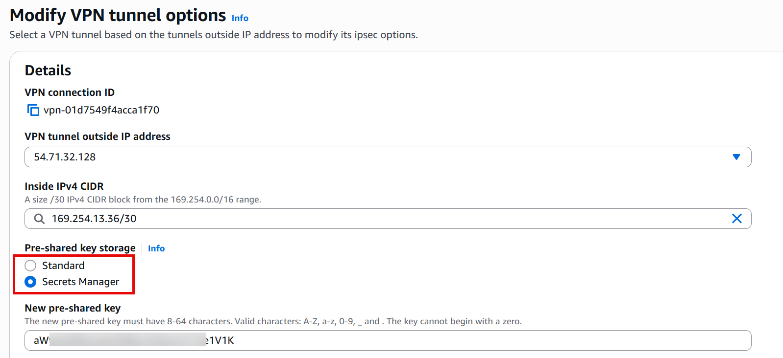 If you want to migrate an existing VPN tunnel to use Secrets Manager storage, then the modify-vpn-tunnel-options command lets you switch the PSK storage type securely through AWS CLI.