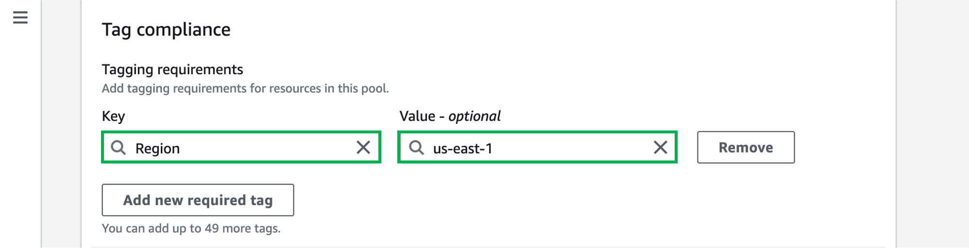 For Tag compliance, all VPCs that will be created using CIDR blocks from this pool must be tagged accordingly with the “Region” pre-defined key and value. If our initial hierarchy would entail more levels (environment, business unit), we would be able to reflect that in the tag requirements for the VPCs, by adding tags like “Environment”, “BU (Business Unit)”, etc.