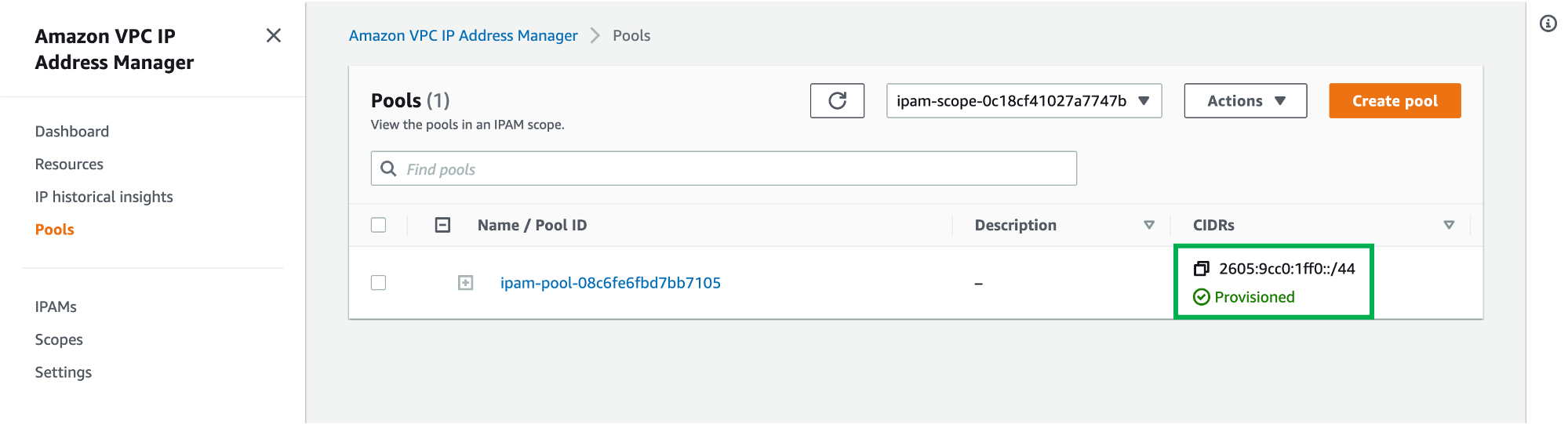 After creation, you can verify the US-EAST-1-POOL status and the CIDR provisioning state, which must be “Provisioned”: