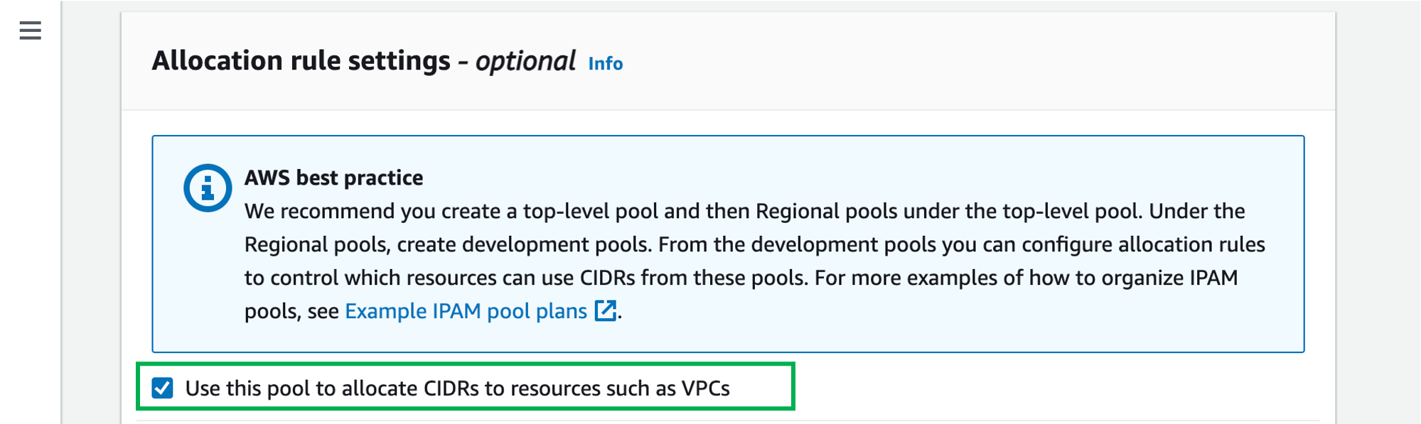 For setting the allocation rules, we need to configure this pool to be used for VPC CIDR allocations: