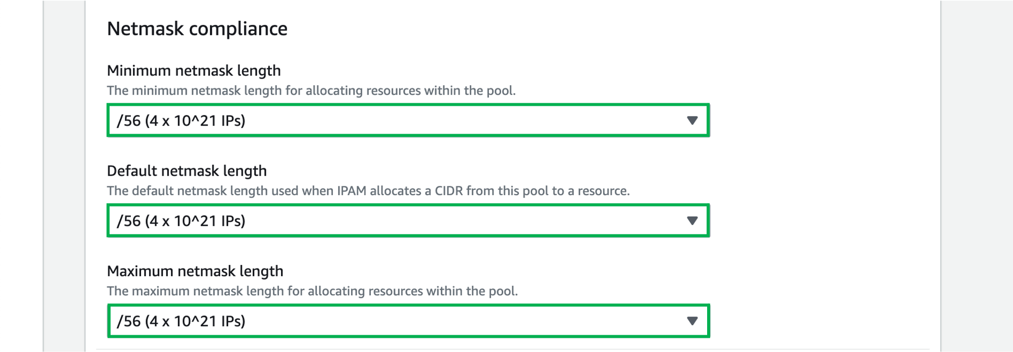 Amazon VPC IPAM facilitates tracking VPC addressing compliance across your environments, through Netmask, Tag and Locale settings. Since the Amazon VPC currently supports /56 IPv6 CIDR blocks, we will reflect that in the Netmask compliance configuration:
