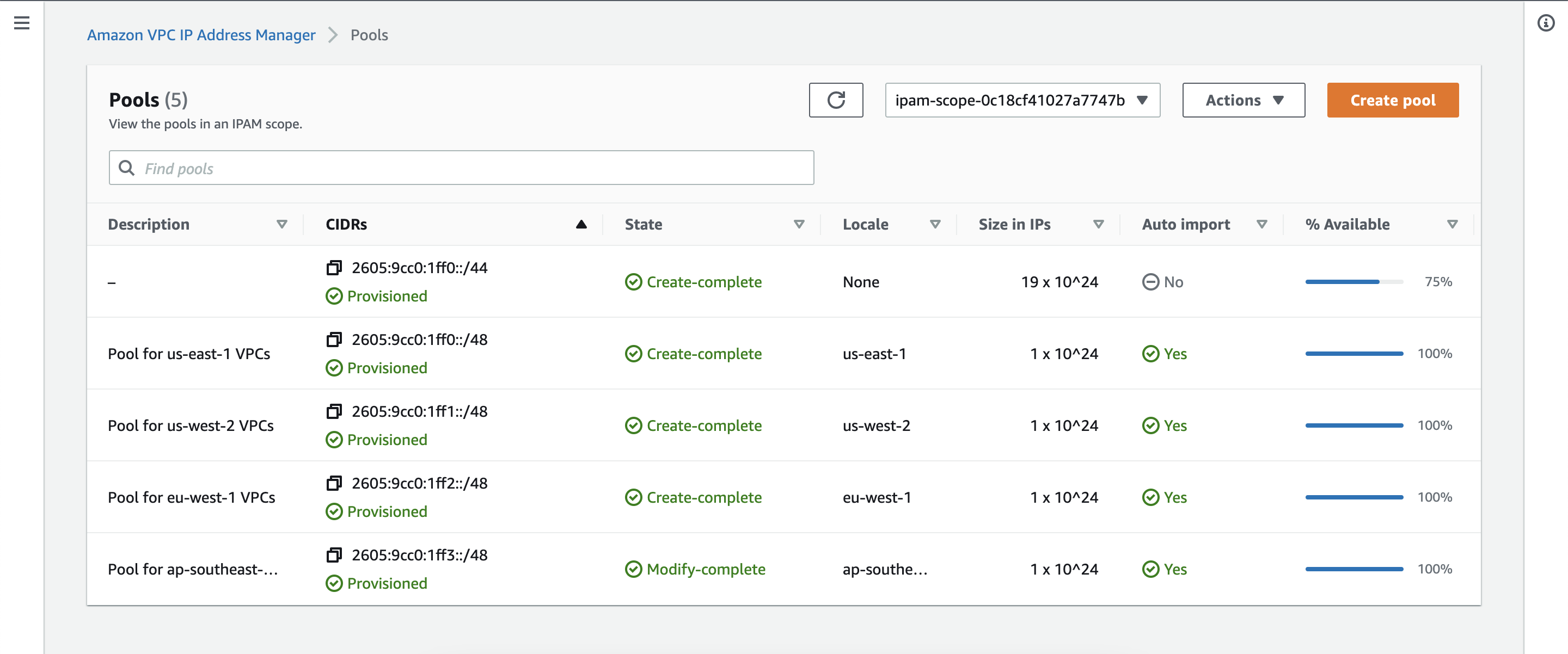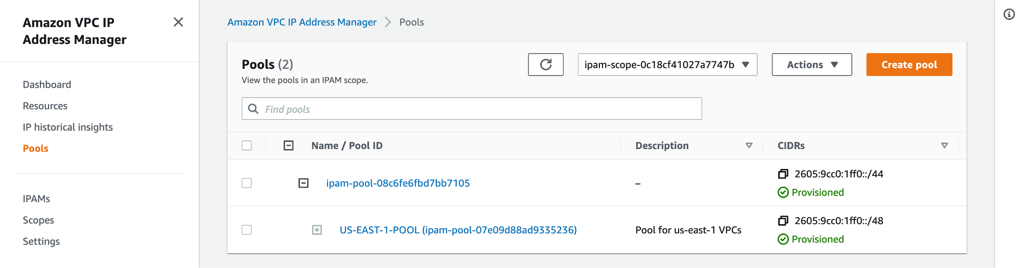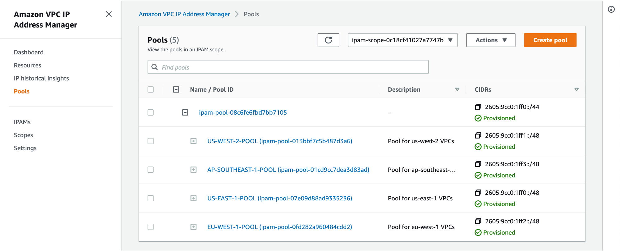 - Simplified management of your existing BYOIPv6 pools – With IPAM, you can easily manage your existing BYOIPv6 pools, without any downtime or resource re-configuration.