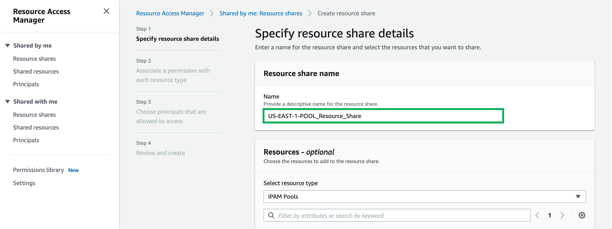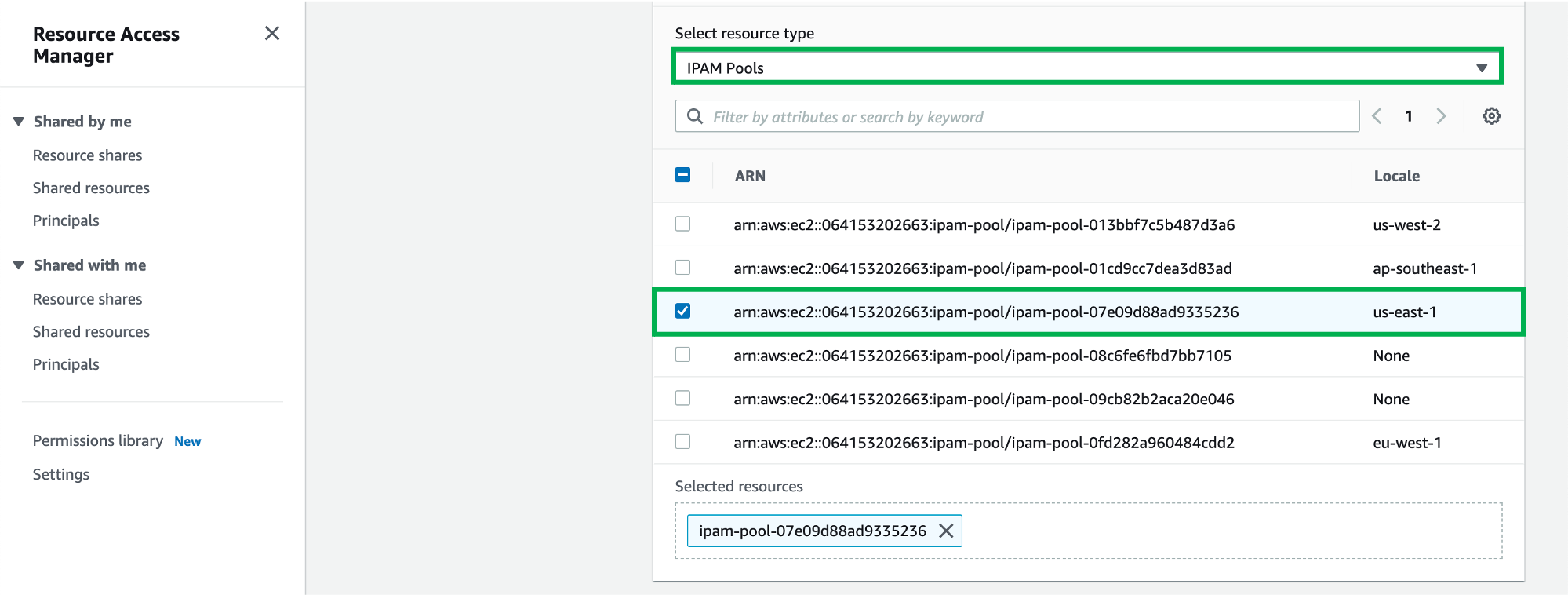 The resource share type is “IPAM Pools” and you must select the IPAM Pools you want to share. We will be sharing our us-east-1 pool with an account in the AWS Organizations: