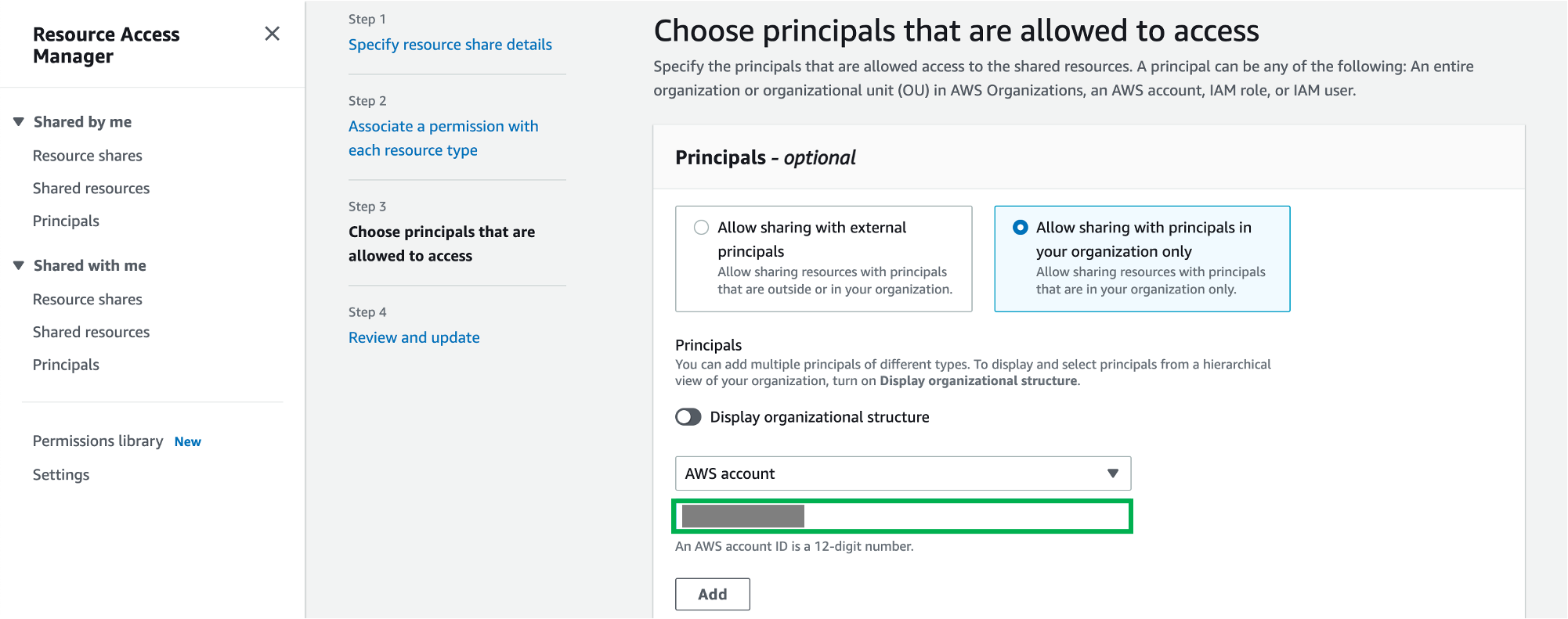 Since we are sharing the pool with an account in our AWS Organization, we need to specify the Account ID:
